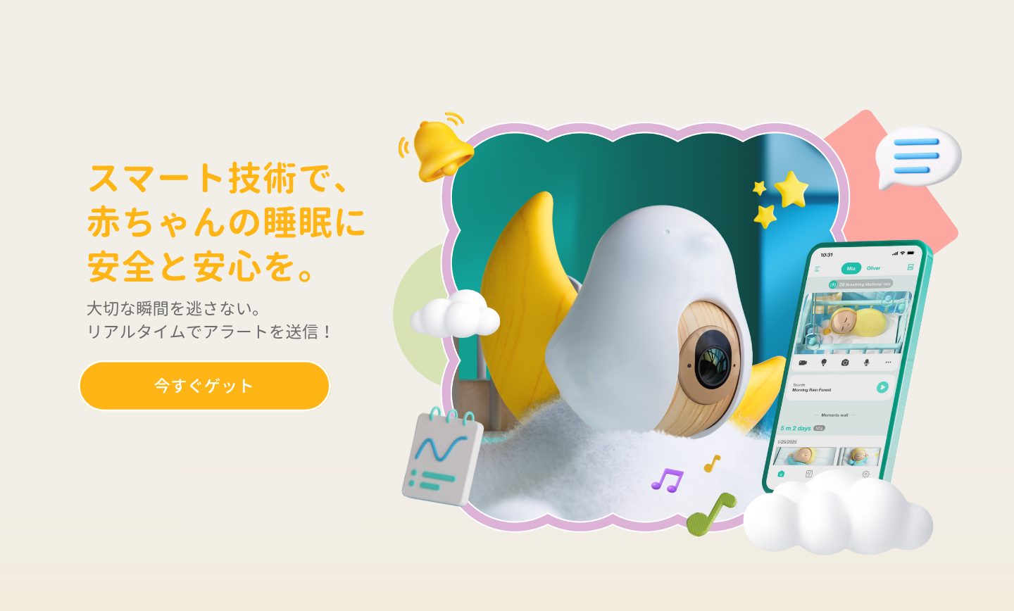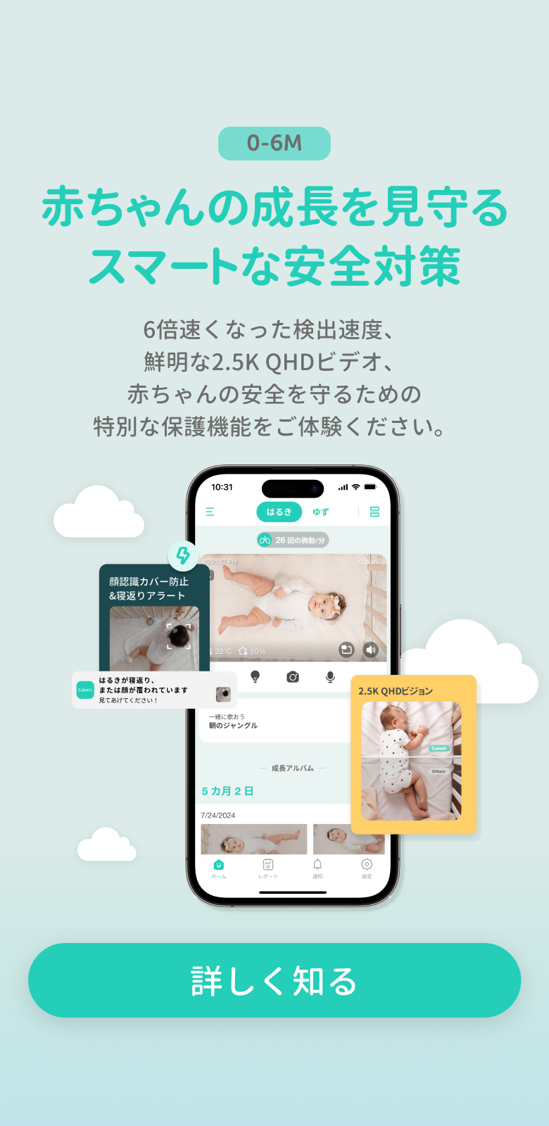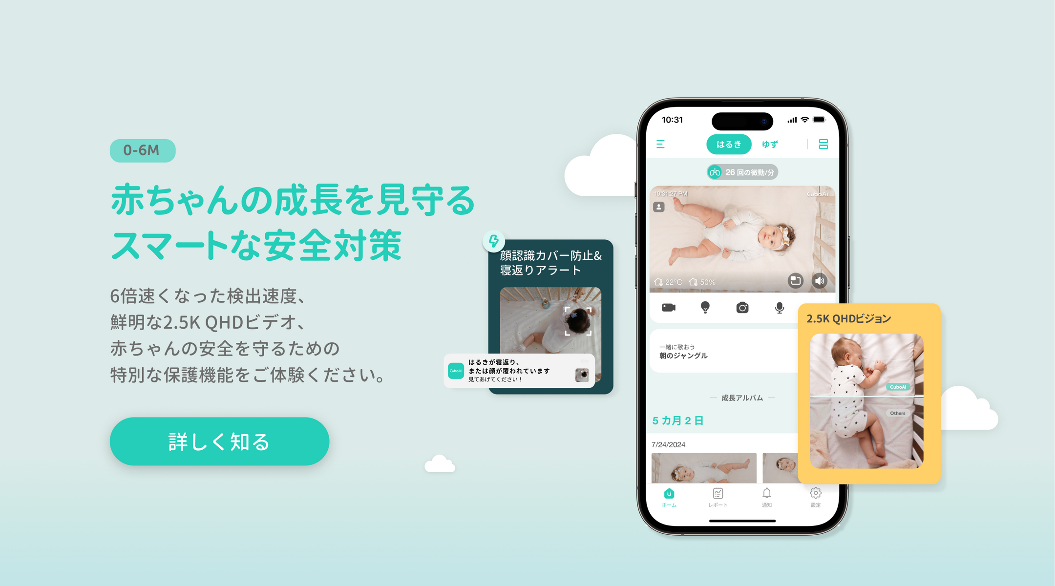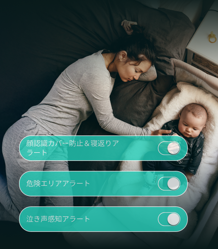 2.5K QHDカメラによる顔覆われや寝返り時のアラート |